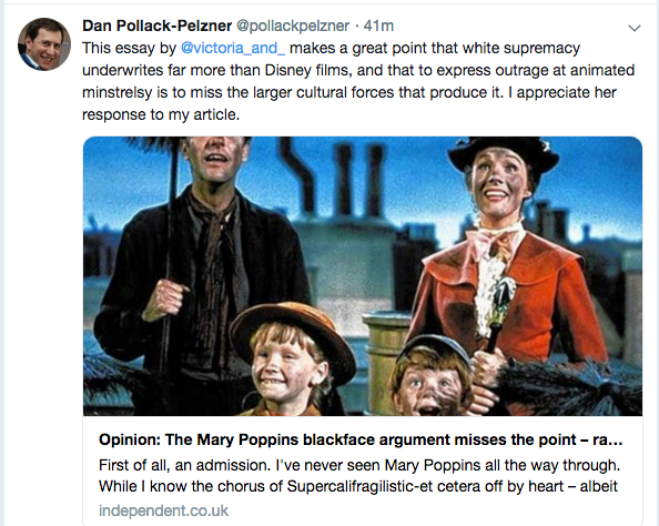 The scene being defamed by this problem child, is the one where Mary Poppins playfully smudges her face with some chimney soot to join the unwashed cast of chimney sweeps in a playful dance.