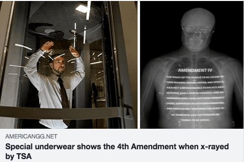 Cute underwear has been created to make the 4th Amendment text appear when walking into one of those TSA “Naked Scanners” as they’ve been called. Still this mild form of protest against the Martial Law at all airport is ill advised since the minor prank requires an otherwise full exposure to a risk of radiation that, with the help of accomplices in media, is largely underestimated.