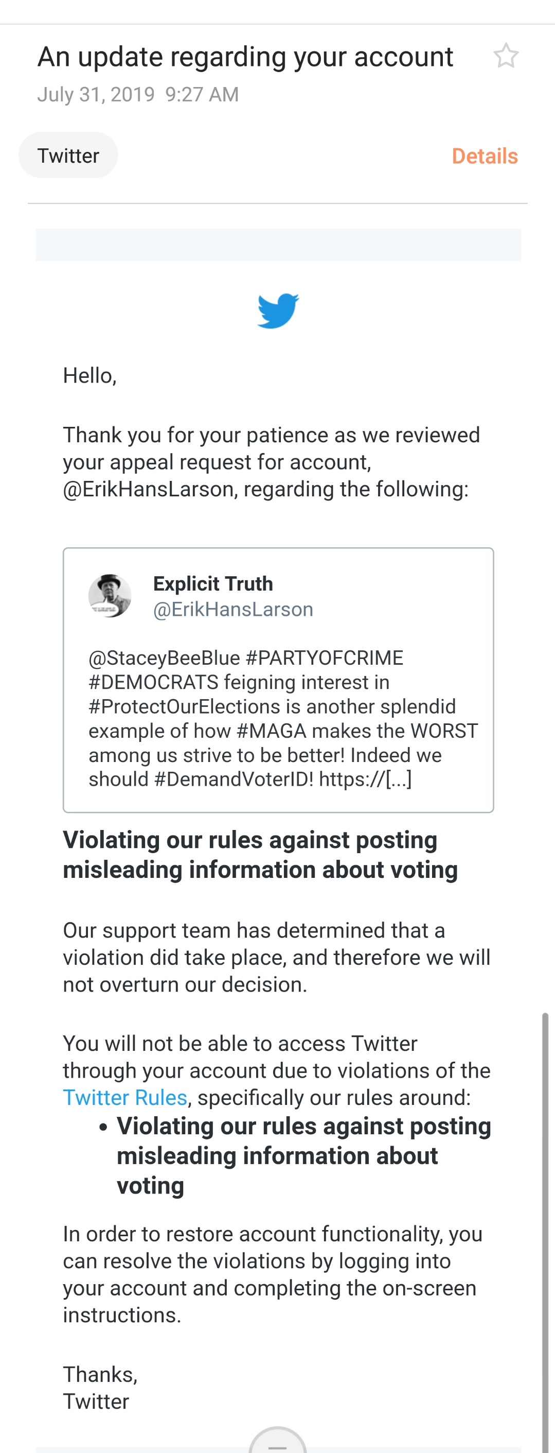 …reported, processed and, even after appealed and reviewed, held up as an example of “Violating” their rules, shows just how desperate Jack and his crony capitalist cohorts are to take controlling the next election all the way down to rigging each and every conversation on their personal webpage previously known as “platform.”