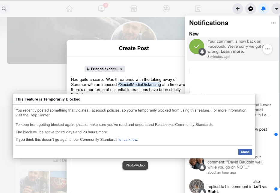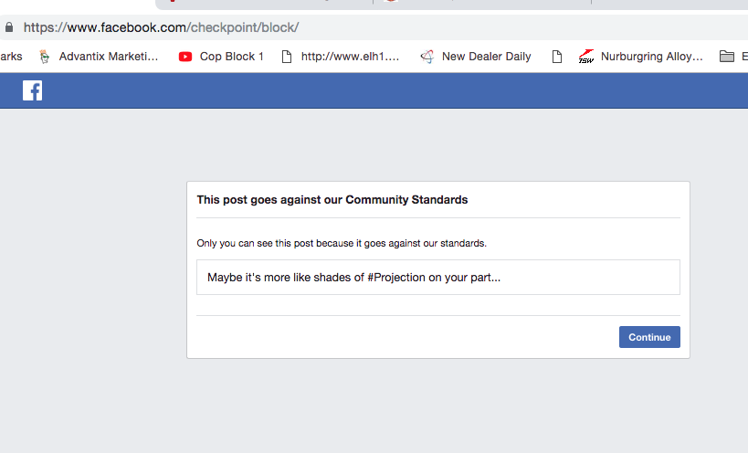 So the FB thought policing automation kicked in and blocked the post, and presented a happy little notification to the same “hateful” originator.