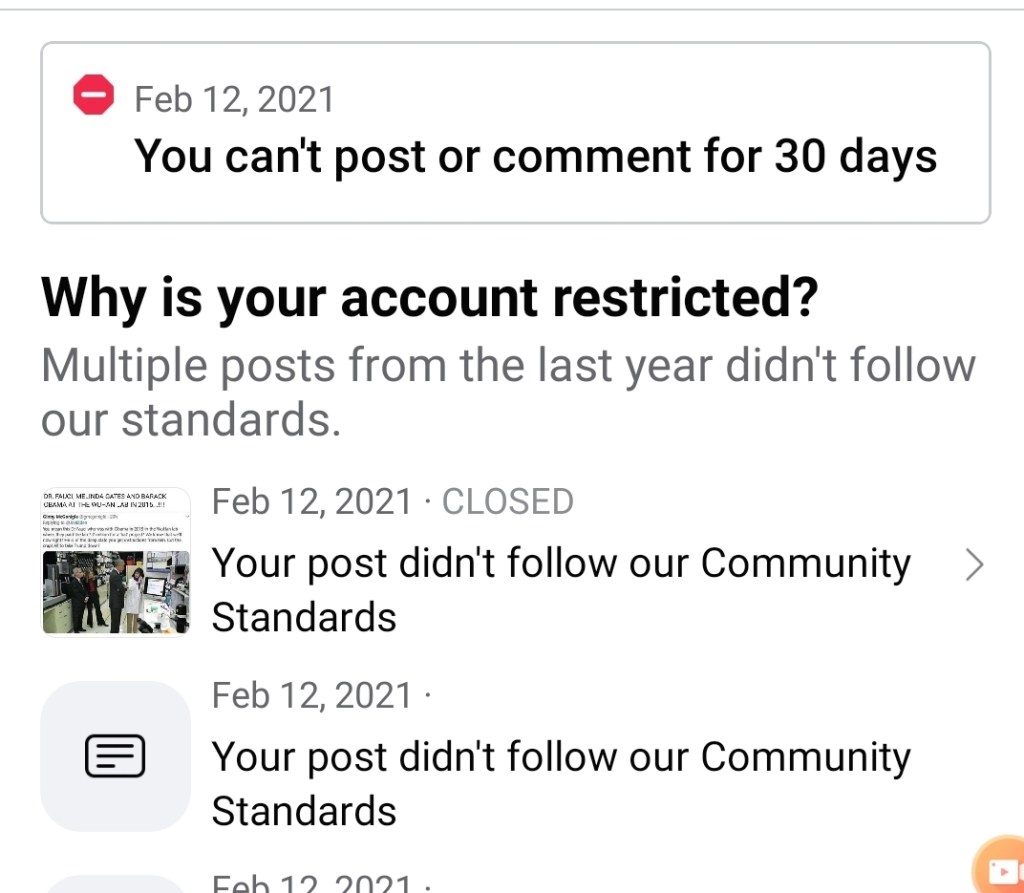 After enjoying a couple days of access, I was removed yet again with a triple whammy that, for the first time, brought a sentence of yet another 30 days for the “violation” of sharing an article to my “Globalist Pricks” page from my this very website.