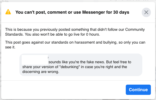 Interestingly, the parameters of FB Jail seem to be modified to allow Private Messaging, but the otherwise standard dish being barred from posts to my own page, any comments to any page or group, or even reacting (via happy face, thumbs up, etc.) is blocked.