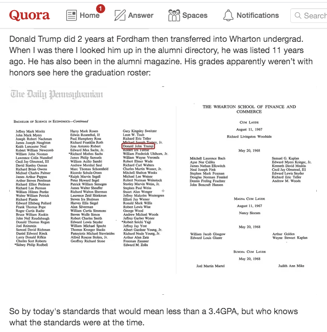 By best estimates Trump’s IQ is 156. But academic performance has been up for some questions. Getting through such a prestigious school as Wharton School of Finance and Commerce is not really an indication of Obama levels of dumb, but as per the above, it may be fair to guess that his GPA was below 3.4.