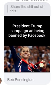 Earlier today, a private message was received from a friend. It included a Trump ad that was apparently “banned” by Facebook and converted into a meme and shared by an unfamiliar third party account with an added “President Trump ad being banned by Facebook” caption.