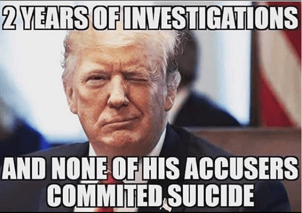 As for the implication that “being investigated” amounts to “being corrupt” or even “criminal,” the ongoing open ended political witch hunt conducted by Weissman (under the branding of Robert Mueller,) and a team of 13 Democrat Lawyers had the unintended effect of proving Trump to be about the most squeaky clean entrepreneur on the planet.