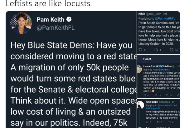 Many take the advice, but the advantages are often short lived. This is because their lefty neighbors that eroded if not destroyed their own home State often are amongst the first to lead by example on their own migration to greener pastures of a “Red State.”