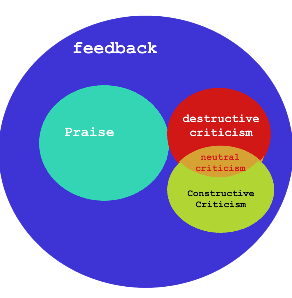 Furthermore, contrary to what’s implied in the California curriculum instruction, “feedback” can include raw praise which isn’t synonymous with “constructive criticism” nor any other sort. For example, “I really love the way you draw!” is a form of feedback, that is a subset called “praise,” and thus mutually exclusive from the other variety of feedback we’d count as criticism.