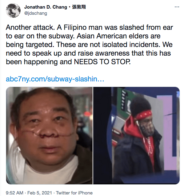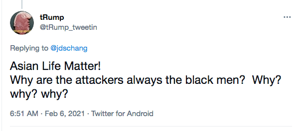 And here’s an example of hate speech on Twitter to fan the flames of Black on Asian violence: