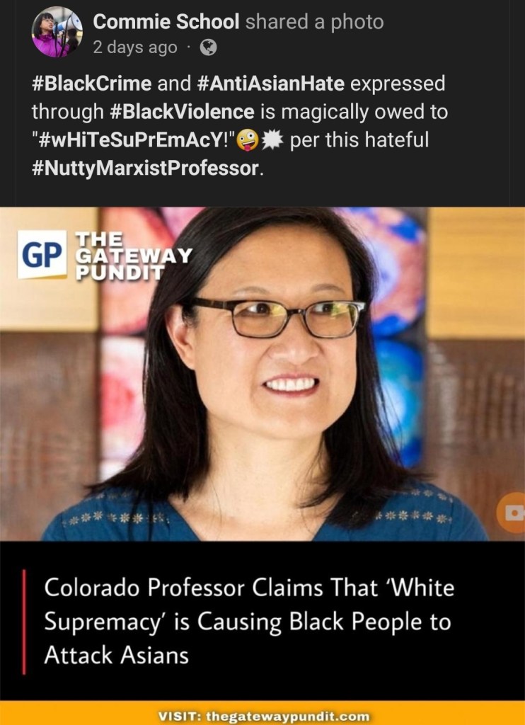 Meanwhile the black crimes will continue, and many are motivated by the hatred spewed as “curriculum” concerning “white” and Asian “privilege,” and the nature of these vile crimes will be obscured to blame any and all good American citizens that may have correctly identified the COVID as “Asian” or “Wuhan Flu” as they were originally told to do by the MSM talking heads on their TV sets.