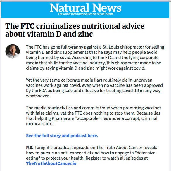 Vitamin D3 and Zinc are proven via scientific studies to play a major role in protection from flu and also mitigating harm done by COVID infections. The highly censored Natural News reports on the latest and most egregious medical fascism to come down from the wildly corrupt and Democrat infested FDA. And now any sound medical advice by qualified medical professors that includes healthier nutrition has been criminalized.