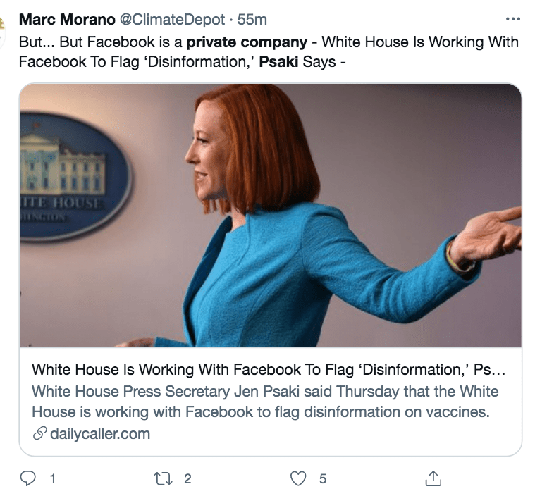And ultimately, now the White House Press Secretary announces that they, the Democrat Party and their stolen Presidency are openly directing the so-called “private companies,” to do censorship on their behalf, which obliterates all pretense of a sound underlying “company rights,” argument that all but fools already knew to be disingenuous, false, and illogical.