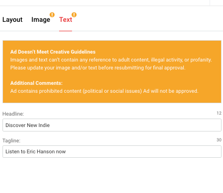 It seems “Discover New Indie” or “Listen to Eric Hanson now” violate some “Creative Guidelines.” The only other alternative explanation might be a problem with the song title itself.