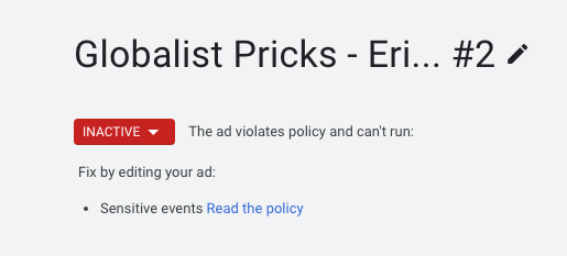 But after replacing the “offensive” art with a more generic image from a prior album color it soon became clear that there were some other problems, and even the “text” of the ad was tagged as “problematic.”