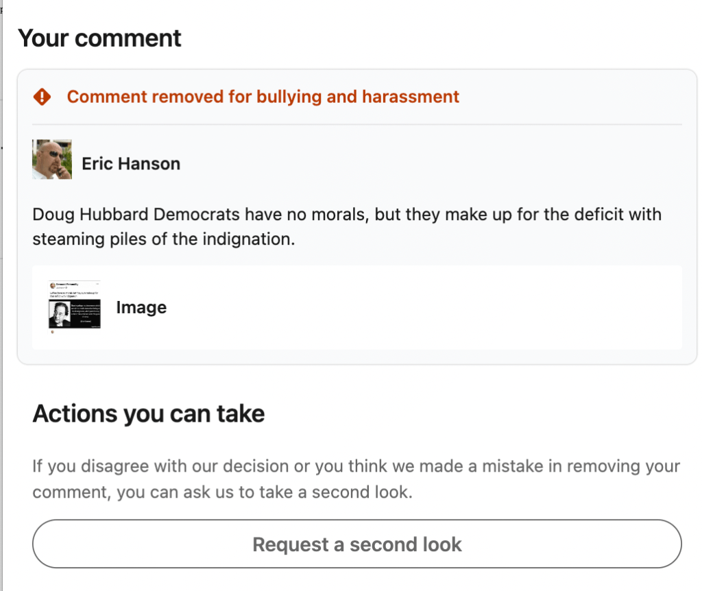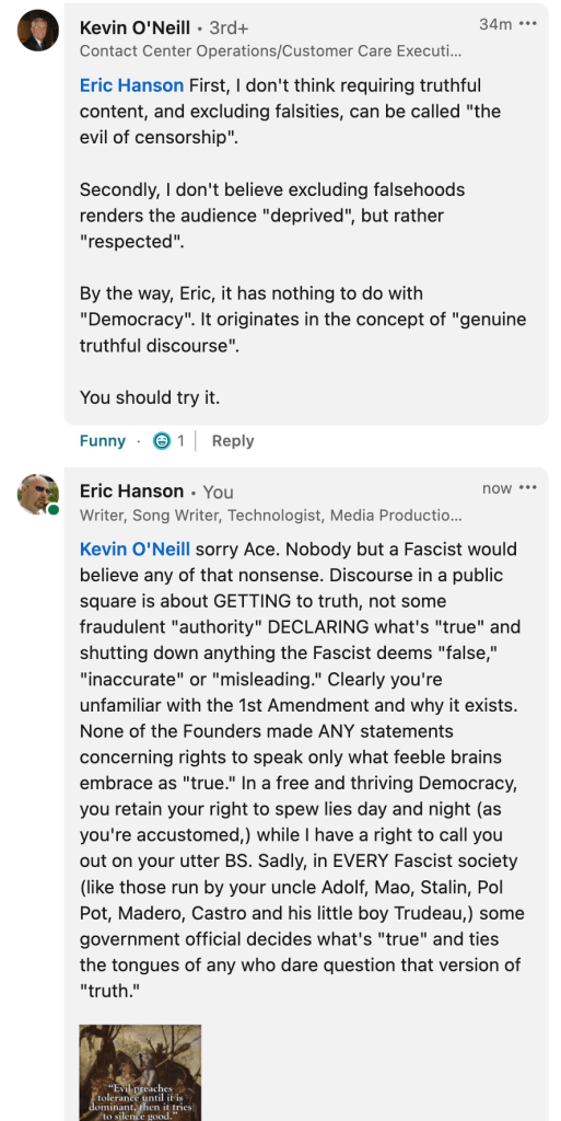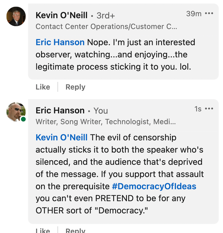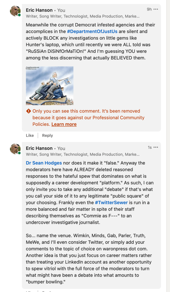 Of course that was met with a response, and by tomorrow, it’s quite possible that the fascistic “moderators” at LinkedIn will delete and, and perhaps impose another interruption of access to professional contacts and career history.