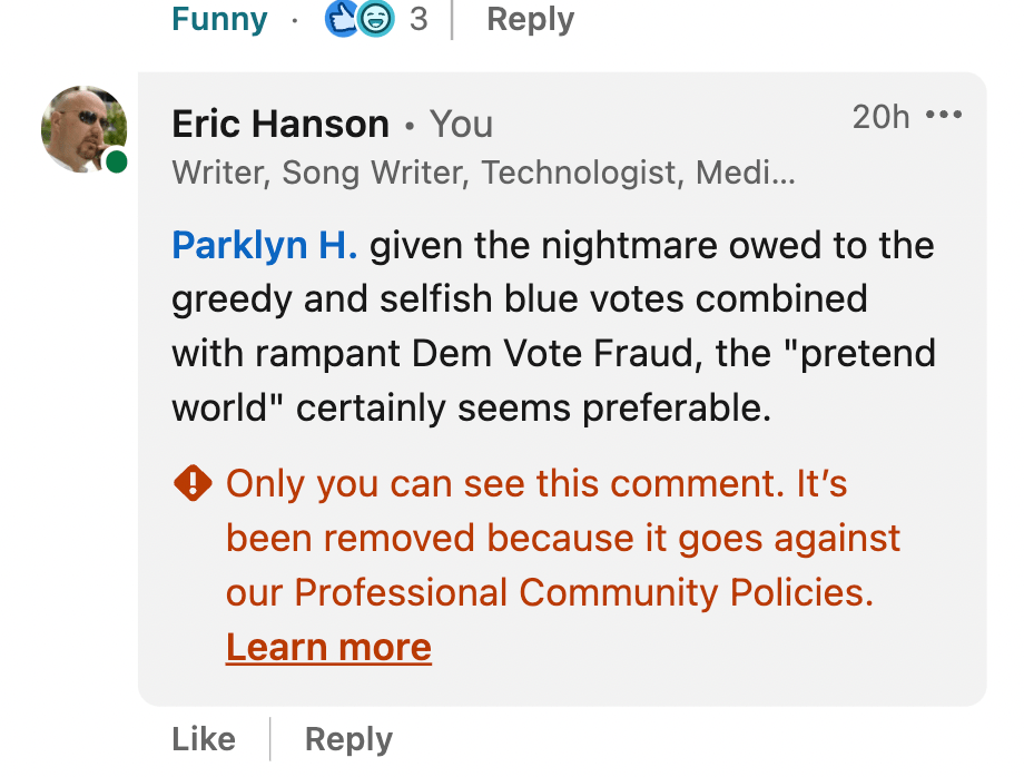 LinkedIn has made it clear that they don’t permit correction of their infesting Leftist who have turned what was once a career development site into a sewer that’s become, by some measures even worse than Twitter. As the defamatory comments by the hateful go unmitigated, attempts to offer any correction comes with great risks. And so this particular rant will be addressed here.
