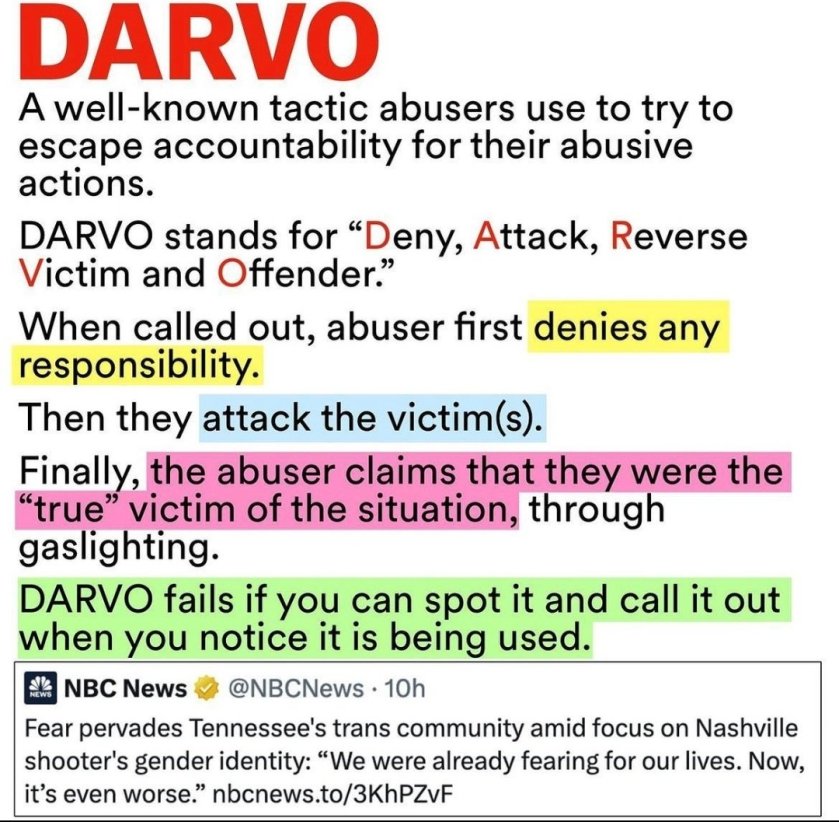 *DARVO is a tactic of reversing the perp and victim, and has been applied in a mostly unseemly manner to a wide range of horrors.
