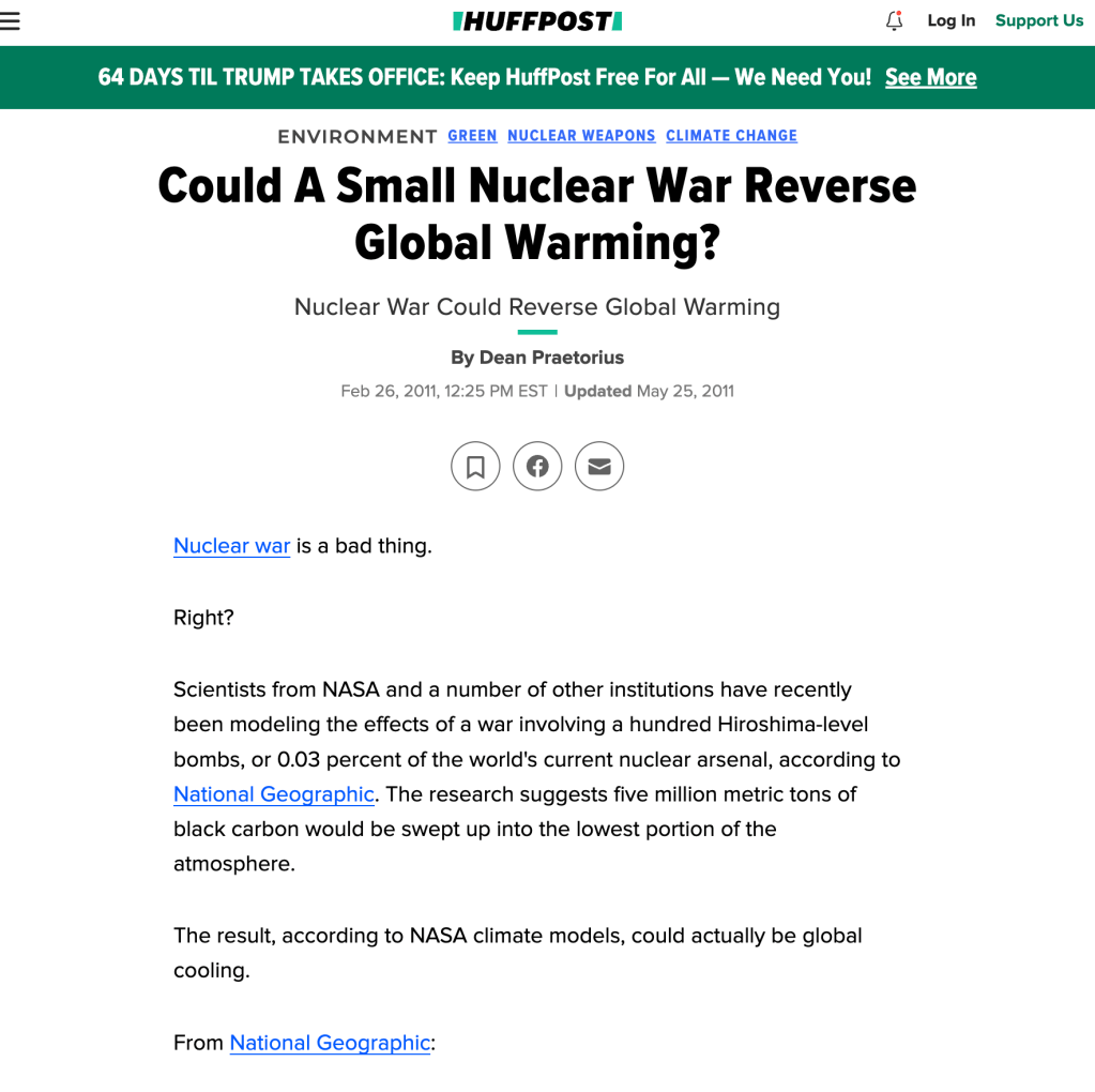 While Trump correctly pointed out that nuclear war was the real threat to humanity, the ridiculous Climate Hoax community has become so unhinged as to suggest a “limited” nuclear war as a possible “solution” to “climate change.”